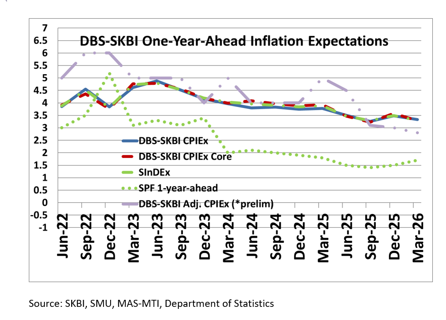 - The One-year-Ahead composite index SInDEx1 that puts less weight on more volatile components like Accommodation, Private Road Transport, Food and Energy-related expenses also dropped to 3.3% in March 2026 compared to 3.5% in December 2025. It is slightly lower than the first quarter’s average of 3.5% since the inception of the survey in September 2011.