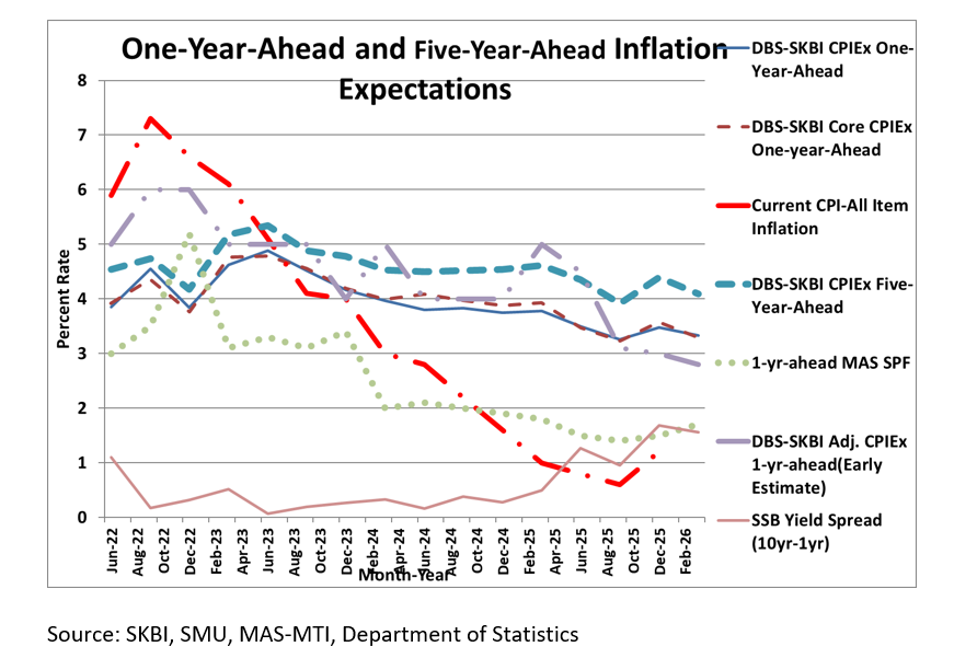 - Excluding the volatile components of Accommodation and Private Transportation, the One-year-Ahead CPIEx core inflation expectations dropped to 3.3% in March 2026 compared to 3.6% in December 2025. For a subgroup of the population who owns their accommodation and uses public transport, the One-year-Ahead CPIEx core inflation expectations also pared to 3.3% in March 2026 from 3.6% in December survey, corroborating the findings. This sub-sample measurement is potentially more representative and hence more accurate than the full sample measurement, due to high home ownership and public transport ridership in Singapore.